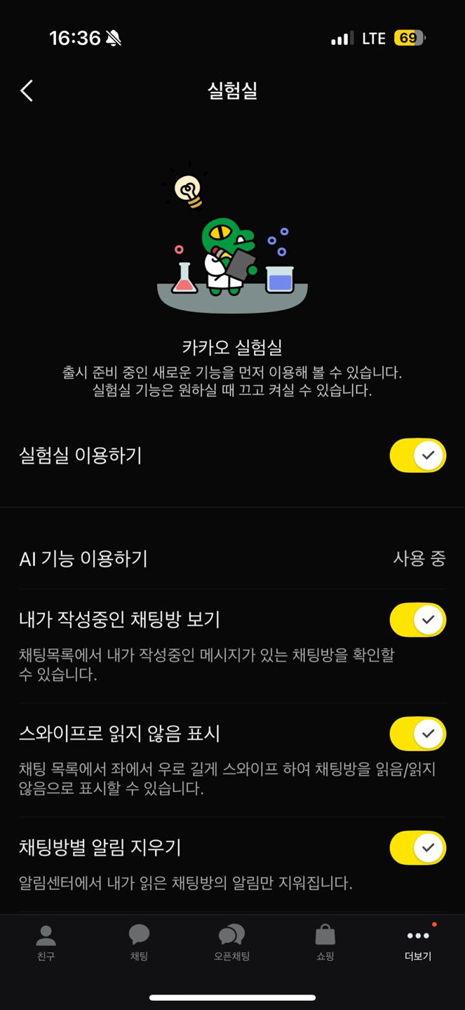 - 카카오톡 실험실의 기능은 테스트 중인 기능으로, 언제든지 변경되거나 사라질 수 있습니다.